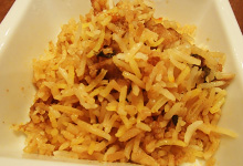 チキンビリヤー二 GMナイルさんのレシピ 2015年03月15日 0 <材料> ※3~4人分 バスマティ米 3合 鶏もも肉(皮をむき、一口大に切る) 700g マリネ液 プレーンヨーグルト 100g にんにく(すりおろし) 小さじ2 しょうが(すりおろし) 小さじ1 サラダ油 大さじ2 塩 小さじ1 パウダースパイス パプリカ 小さじ2 コリアンダー 小さじ2 ガラムマサラ 小さじ1 クミン 小さじ1/2 ターメリック 小さじ1/4 玉ねぎ(薄切り) 1個分 ミント(スペアミントの粗みじん切り) ひとつかみ 香菜(粗みじん切り) ひとつかみ 牛乳 大さじ1 サフラン ひとつまみ 水 2リットル 塩 小さじ2 揚げ油 適量 香菜(仕上げ用。ちぎる) 適量 ホールスパイス カルダモン 5粒 クローブ 5粒 シナモン(皮片) 2片(またはシナモンスティック1本でも可) ベイリーフ 2枚(ローリエでも可) <作り方> ウルにマリネ液を混ぜ合わせ、鶏もも肉にもみ込んで冷蔵庫に1時間おいて、牛乳を電子レンジで軽く温め、サフランを浸けておきます。 揚げ油を熱して、玉ねぎを入れ、高温で香ばしく揚げる。 バスティ米をやさしく洗い、水気を切ります。鍋に水とホールスパイス、塩を入れて火にかけ、沸騰したら米を加え、5~6分ゆでる。 別の鍋に(1)の鶏肉と(2)の半量、(3)のゆで汁100ミリリットルを入れて火にかけます。 沸騰したら中火で5分煮て、ミント、香菜を散らします。 (3)をざるで湯切りして、(5)の鶏の上にのせます。 (1)のサフラン牛乳を全体にかけます。 残りの(2)をまんべんなく散らして、弱火にして蓋をして、10分加熱して火を止め、10分蒸らします。混ぜずに器に盛り、香菜をのせてできあがり! 【ポイント】 ・お米は長粒米を使うこと。塩味(スパイス+塩)をきっちりきかせること。 ・洗い方は優しく(とぐと割れるので優しく!)。 ・しっかりマリネすること(ダム式 生肉) ・フライドオニオンでうまみとコクを。 ・パクチー、スペアミント、サフランが重要! ◎炊きあがっても、絶対に混ぜるべからず!! (白いご飯とスパイスの茶色、黄色い層ができてこそ!) ★かんたんチキンビリヤー二 <材料> ※3~4人分 鶏もも肉 200g 玉ねぎ 1/2個分 カシュナッツ 30g 粉末鶏ガラスープ 大さじ3 米 2合 水 適量 香菜 適量 スパイス カレー粉 小さじ2 カルダモン 5粒 クローブ 5粒 <作り方> ねぎは薄切りに、鶏もも肉は小さめの一口大に切る。 洗った米を炊飯器に入れたら、水、カレー粉、鶏ガラスープを加え、全体をよく混ぜ合わせる。 鶏もも肉、玉ねぎ、カシュナッツ、カルダモン、クローブを全体に広げるように並べて、炊飯器のスイッチを入れる。 炊きあがったら一度、全体を大きく混ぜた後、フタを閉めて少し蒸らし、器に盛って、ざく切りの香菜を飾ってできあがり! PR